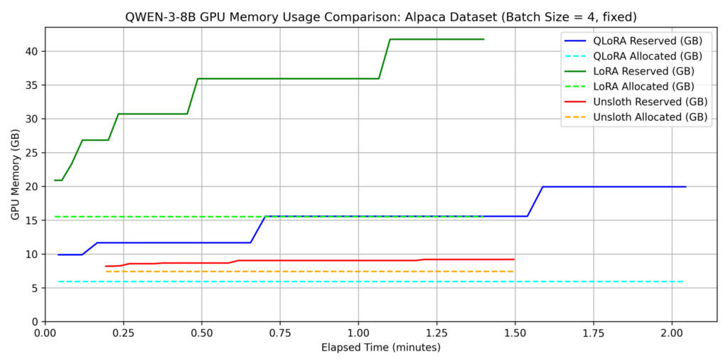For standard LoRA/QLoRA, batch_size=4 exceeded the 96GB VRAM, so we used batch_size=2. However, Unsloth worked fine even with batch_size=32. This demonstrates that memory-efficient frameworks allow for larger batch sizes, improving parallelism and shortening training time.