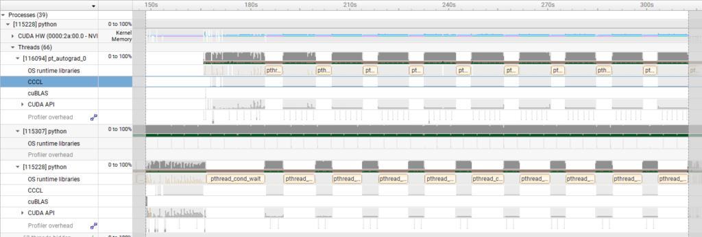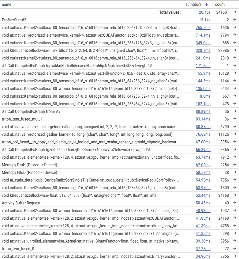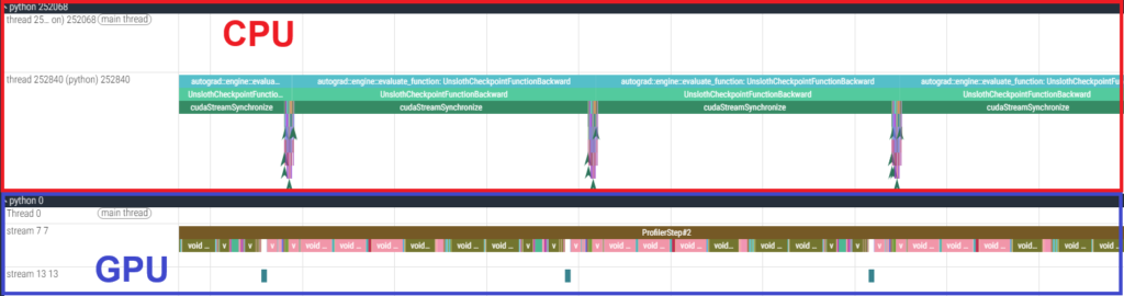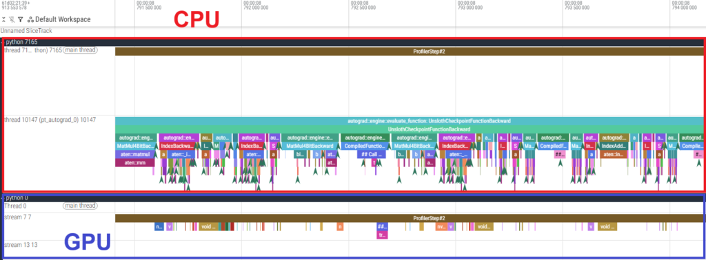 To investigate the cause, we used the PyTorch Profiler to analyze the fine-tuning of GPT-OSS-120B. Below are the execution time tables for each kernel and a timeline snippet of the backward pass.