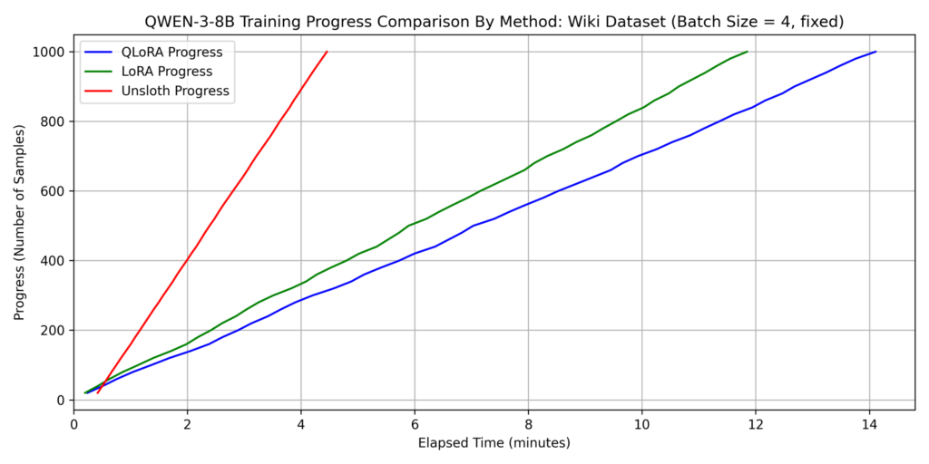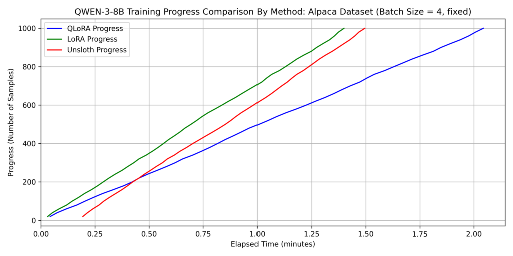 We evaluated three methods: LoRA, QLoRA, and QLoRA with Unsloth (hereafter “Unsloth”). For this section, batch_size=4 was used for all methods.