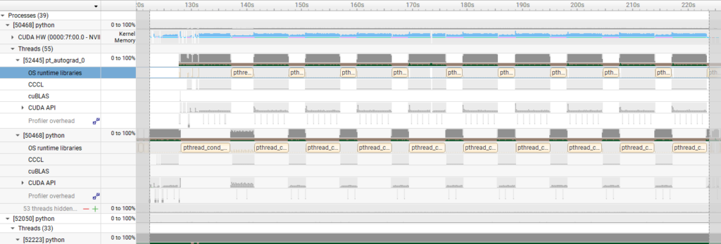 Furthermore, we conducted profiling for the Qwen3-32B using the PyTorch Profiler, which revealed that the GPU was utilized almost constantly, as shown in the figure below. Unlike the MoE model, the Qwen3-32B is a dense model with a larger number of trainable parameters. Consequently, the increased GPU processing load made the task GPU-bound. This explains why the H100 SXM5, with its superior raw arithmetic performance, achieved higher speeds in this specific case.
