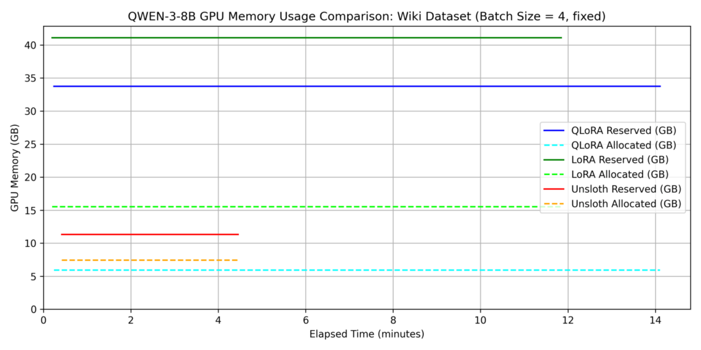 - Unsloth significantly reduced the gap between allocated and reserved memory, indicating superior memory management. Specifically, in Dataset 1, reserved memory for Unsloth was roughly 80% lower than standard LoRA.