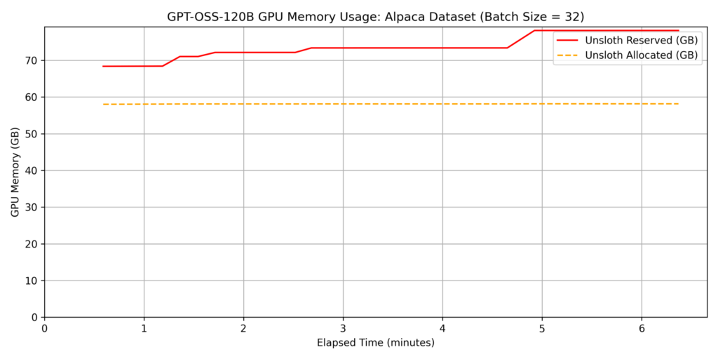 The previous experiments demonstrated Unsloth’s efficiency in memory management and speed. Building on these results, we evaluated the performance of fine-tuning GPT-OSS-120B, a model with a much larger parameter count.