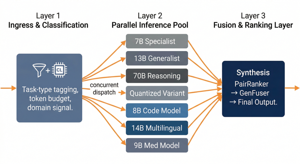 Fusion & Ranking Layer. Raw outputs from the constellation are aggregated through a learned fusion mechanism. This is where approaches like PairRanker (pairwise comparison of candidate outputs) and GenFuser (generative fusion of top-ranked candidates) come into play. The fusion layer doesn’t just pick the best response. It synthesizes a response that inherits the strongest signal from each contributing model [2].