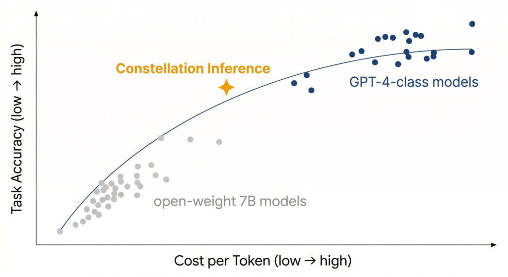 Picture a scatterplot with cost-per-token on the x-axis and task accuracy on the y-axis. Each model is a point. GPT-4-class models cluster in the upper-right: high accuracy, high cost. Open-weight 7B models sit in the lower-left: cheap, but limited. The Pareto frontier, the curve connecting the points where no model is strictly better on both axes, represents the best you can do with any single model. Constellation inference doesn’t pick a point on that curve. It constructs a new point above it, by combining the outputs of models scattered across the entire plot. The fused result inherits accuracy from the upper-right and cost structure from the lower-left, landing in a region no individual model can reach alone.